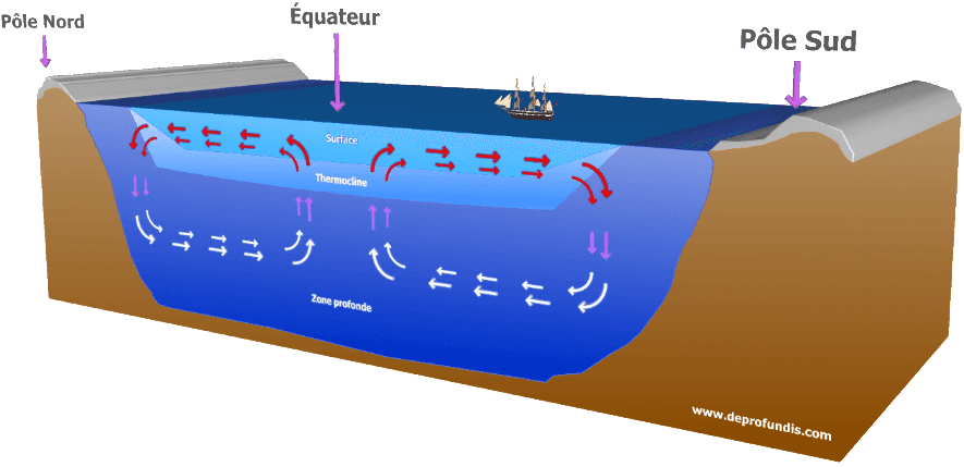 - Le fond des océans : le mouvement convectif les fonds océaniques entretient une couche froide située de 800 à 1000 m de profondeur. La basse température des eaux profondes est due à ce mouvement qui déplace dans les profondeurs des masses d’eau polaires vers l’équateur.