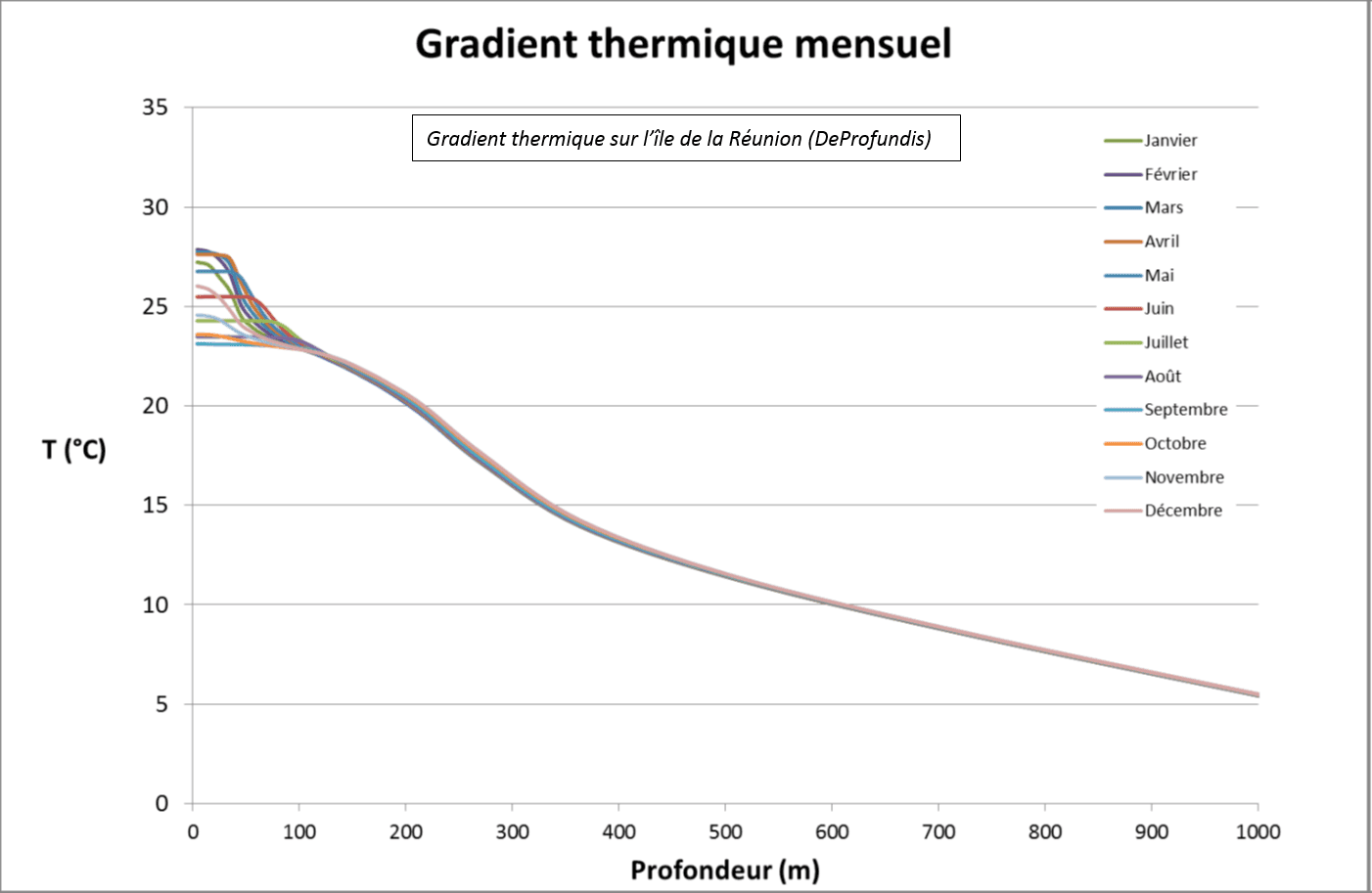 Voici à titre d’exemple le gradient thermique observé au large de la côte sud de l’île de la Réunion. On observe une variation saisonnière dans les 200 premiers mètres de profondeurs, dus principalement à l’apport du soleil qui varie dans l’année. Cependant, au-delà, on observe une persistance et une stratification des couches d’eau affichant un gradient thermique uniforme toute l’année. Cela atteste de la disponibilité de cette source froide dans l’année.